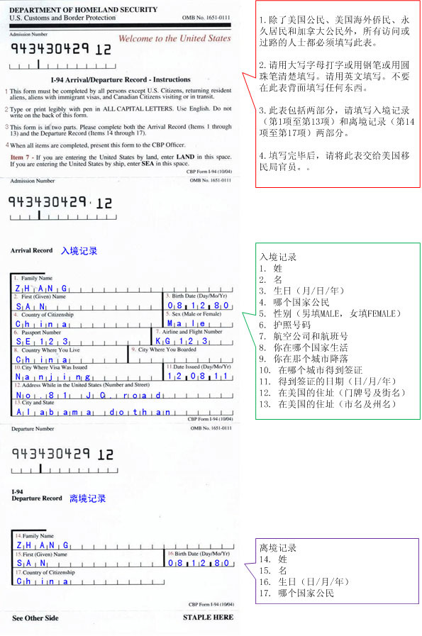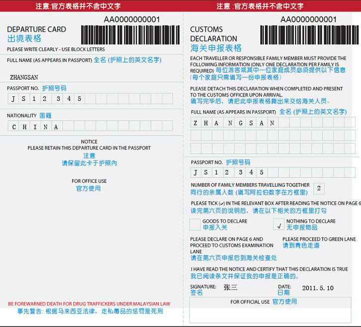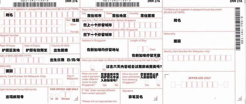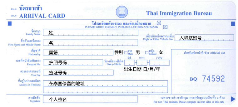 入境卡正面:
